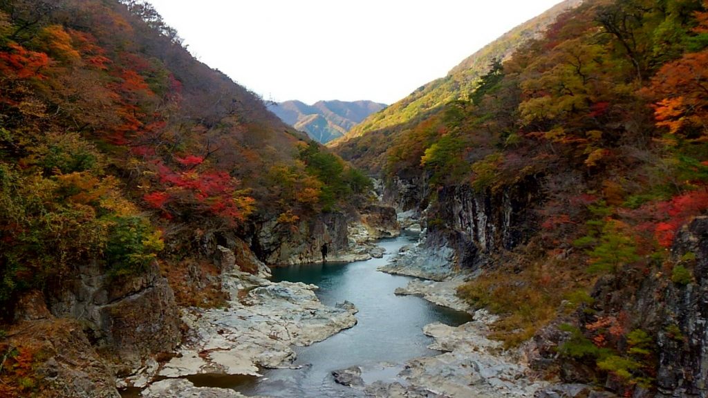 東京の東武線浅草駅から特急スペーシアに乗って鬼怒川温泉駅へ。そこから各駅電車に乗り換えて龍王峡駅に着く。ホームに立つと、鮮やかなモミジが見える。まさに、紅葉まっさかりの渓谷に来た。